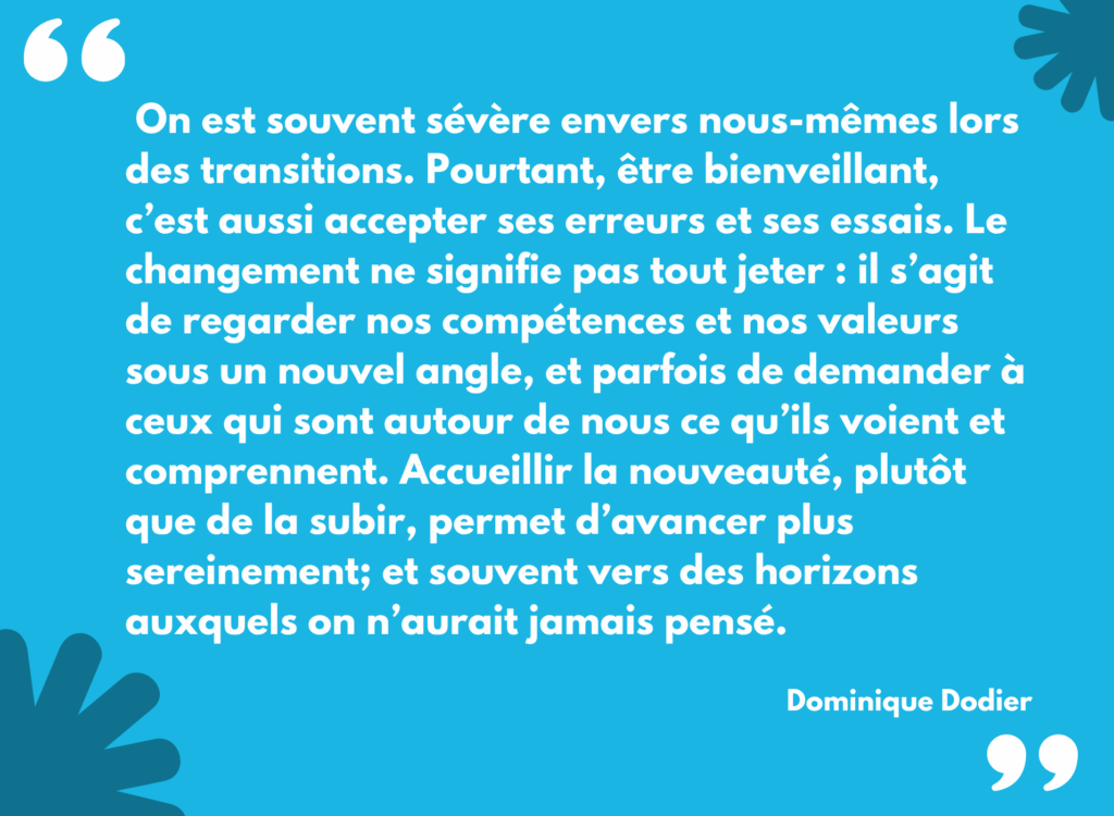 « La seule constance dans nos vies, c’est le changement. On peut choisir de l’accueillir, de l’inviter ou de le subir; et quand on l’accueille, il se fait souvent avec plus de douceur et plus de temps devant soi. »